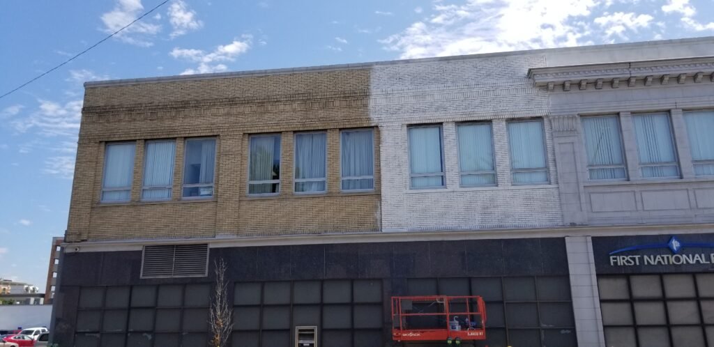 Powerwashed and painted exterior walls with clean lines and durable finishes to protect and beautify the building.